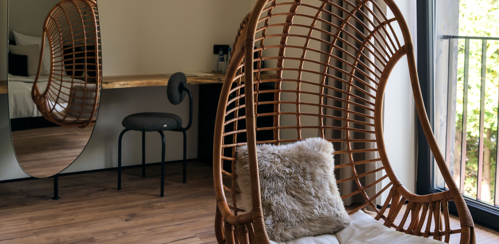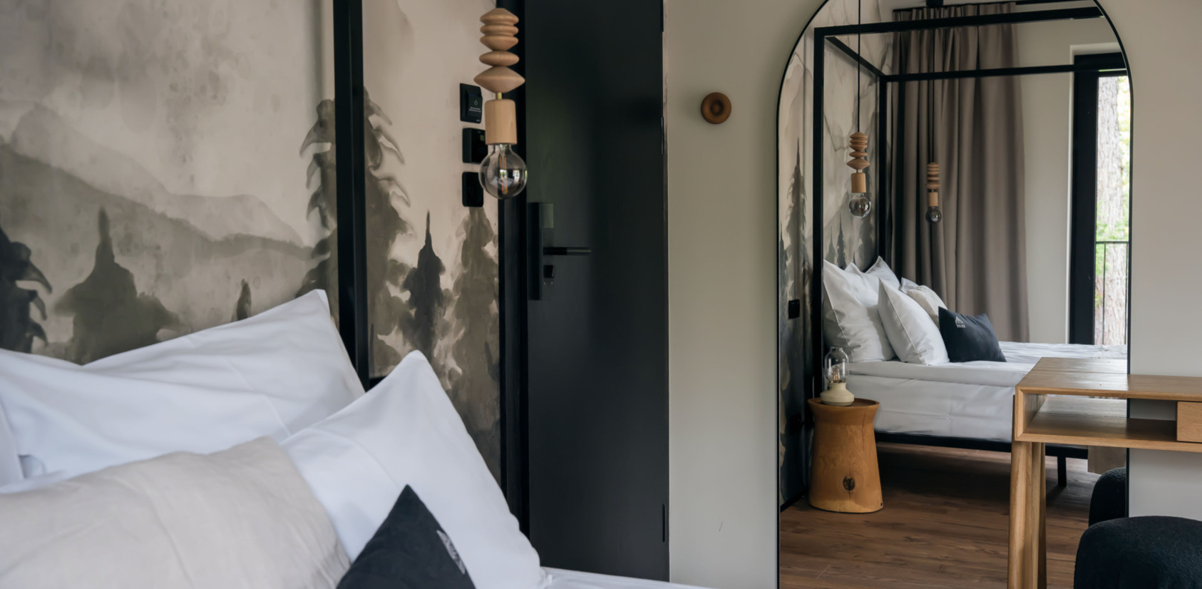Handmade wooden lamps, many rounded shapes. Cohesive color patterns. Headrests in rooms. The reception and bar allude to the elevation outside. Brass plinths in the bistro harmonize with other decorative elements, leather handles and hangers. The wallpaper showcasing a forest has been custom-made. Furthermore, various graphical elements can be found here on the website or in our stationer’s. Being at SLOW, slow down… and see other unique combinations.