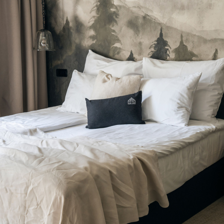In our interiors, you will find soft and sleep-conducive recycled cotton, silk and wool because ecology is also quite significant to us. Most of our furniture, headrests and lamps are made of wood, mostly oakwood, but some elements are made of modern steel. Wooden stairs in hallways in the main building remember the very beginning of this facility. We have restored them by adding modern guardrails. In some bathrooms you will find stone wash basins, made of river rock. The natural stone can also be encountered in our bistro and SPA.